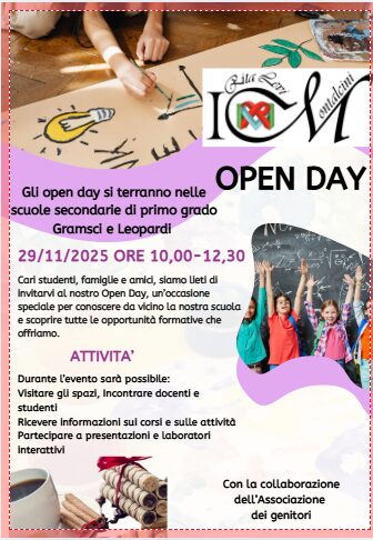 siamo lieti di invitarvi al nostro Open Day, un momento speciale in cui la scuola apre le porte per far conoscere da vicino la nostra offerta formativa, gli spazi e le attività che caratterizzano la vita scolastica.